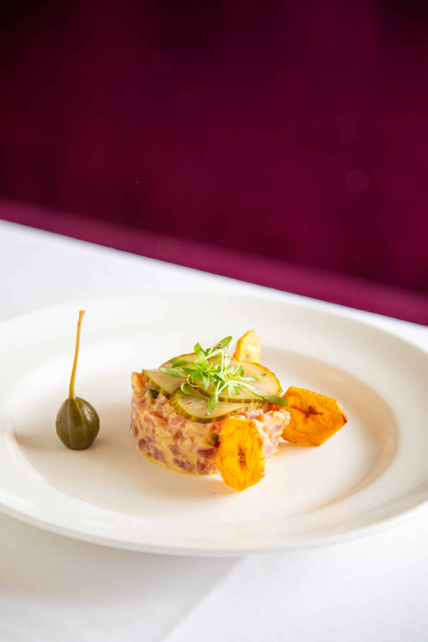 Ahi tuna, Dijon mustard, dill, capers, pickled cucumbers and plantain chips