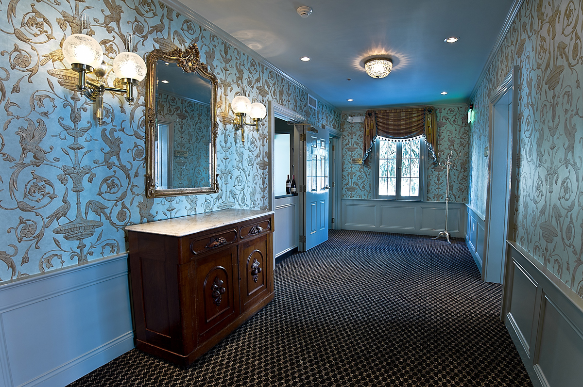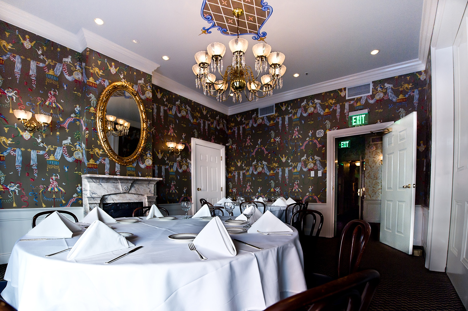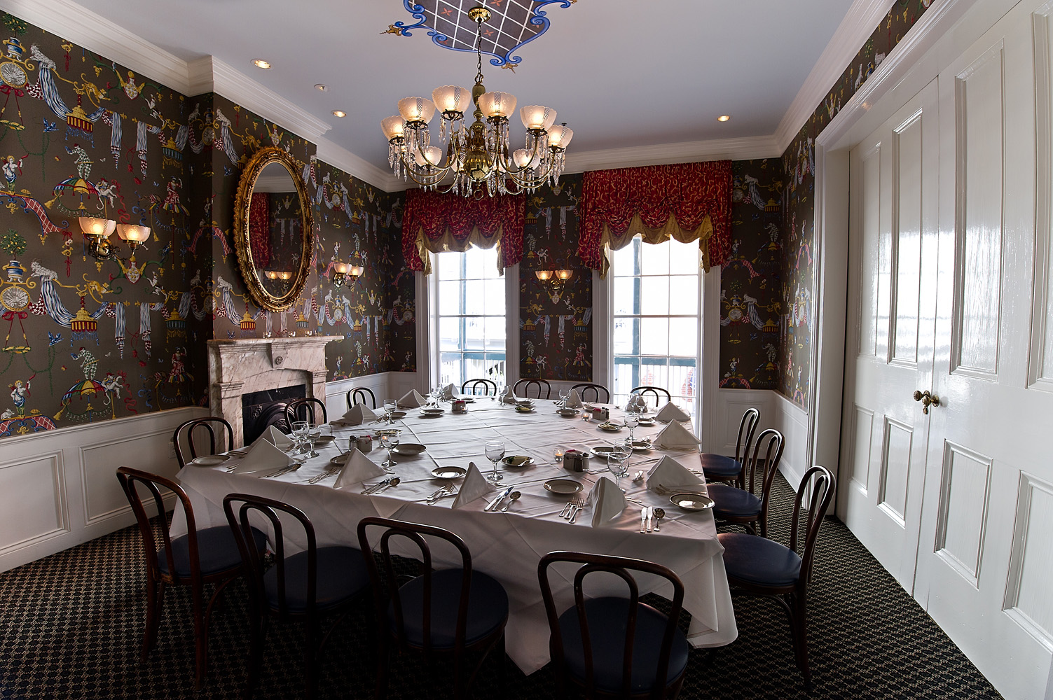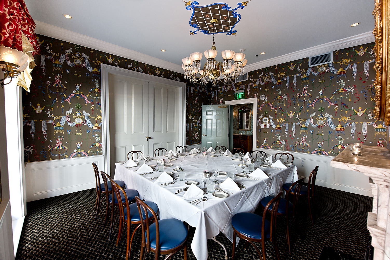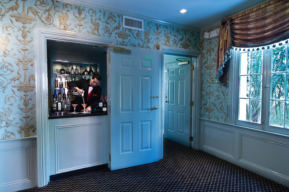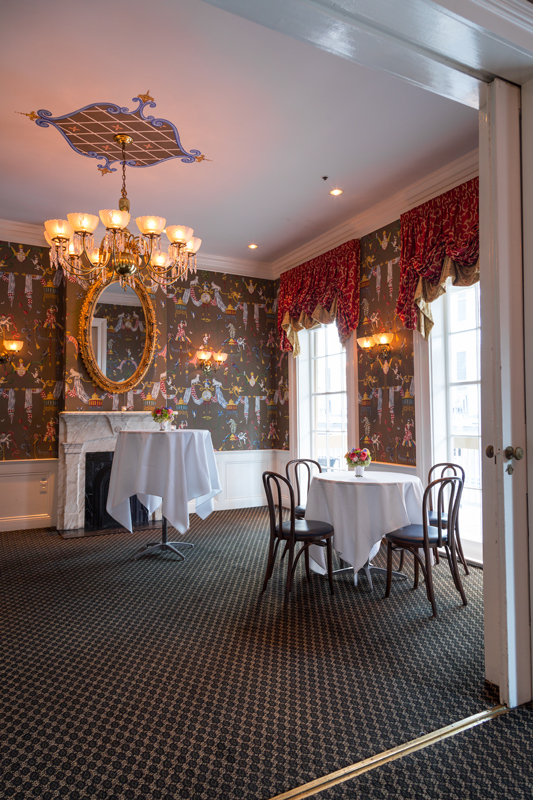 A generous covered balcony overlooking Bourbon Street spans this pair of parlors which are dressed in French blue and white with gold accents. Focal point fireplaces accent the area, highlighted by chandeliers and wall sconces. An adjoining private bar and receiving area welcomes your guests.